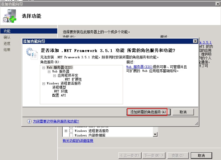 3、最后点击添加所需的角色服务——继续点击下一步直到安装完成,如下图所示: