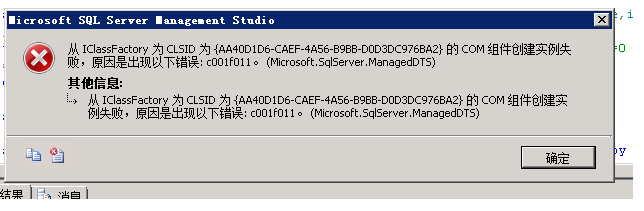 如何解决SQLserver manager创建作业失败c001f011 问题描述: 使用SQLserver manager创建作业会提示如下所示错误: 解决方法: 1)首先在命令行执行:regsvr32 “c:\Program Files\MicrosoftSQL Server\100\DTS\Binn\dts.dll” (注意路径,请改成实际路径) 2)然后将dts.dll再重新注册一次,重新打开管理器,再进行创建维护计划就可以了。 如果问题还未能解决,请联系售后技术支持。