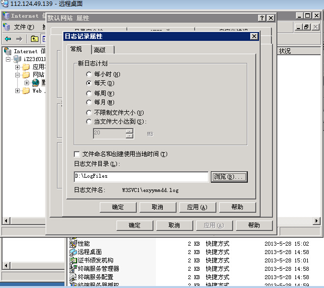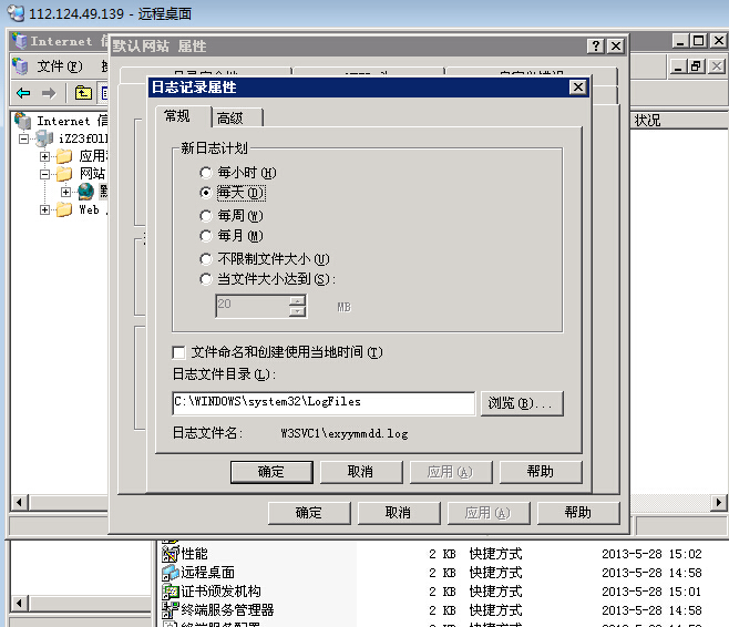 如何避免WIN2003系统更改IIS日志路径避免系统盘用满 WIN2003系统IIS日志路径默认是存放在C:\WINDOWS\system32\LogFiles下的,随着网站的访问日志量也会不断增大,可能会导致40G系统盘是不够使用,客户可以通过修改日志路径的方法,使日志存放在其他盘符里。 修改方法如下所示: 1)用户登陆服务器后,首先进入IIS-站点--属性--网站选项卡,然后点击启用日志记录的属性,如下图所示: 2)用户在这里可以看到默认日志路径是C:\WINDOWS\system32\LogFiles,如下图所示: 3)用户可以提前在数据盘D创建一个LogFiles目录,之后点击浏览到D:\LogFiles,确定操作就可以了。如下图所示: 如问题还未解决,请联系售后技术支持。