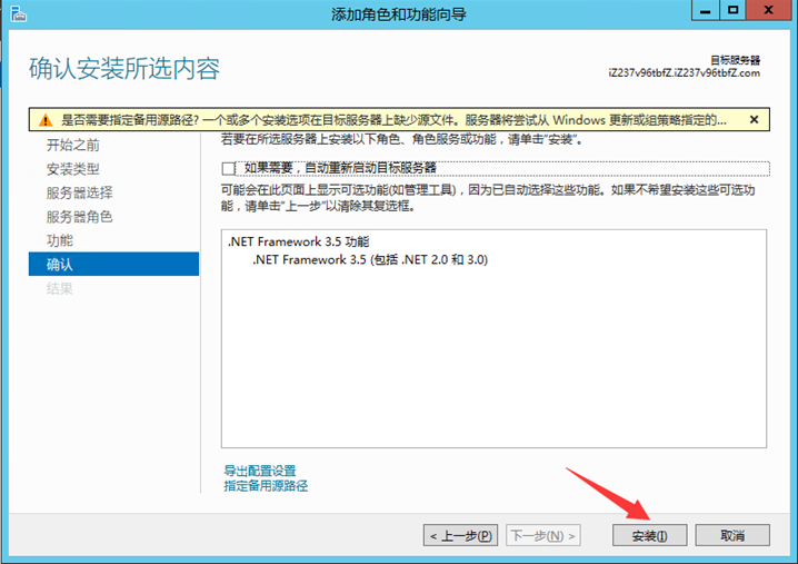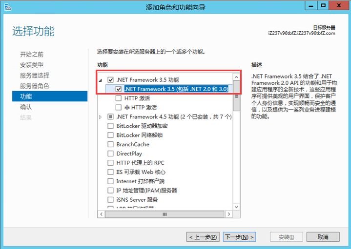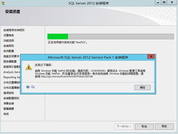 如何解决ECS Windows 2012安装SQLServer 2012过程中出现“启用windows功能NetFx3时出错” 问题描述: 在服务器(Windows server 2012)上安装SQL Server 2012的过程中,安装停留在下图所示的界面上,显示”正在启用操作系统功能NetFx3”随后出现提示框,告知启用windows功能NetFx3时出错。如下图所示: 问题分析: NetFx3是指.NET Framework 3.5。SQL Server 2012数据库的运行需要依靠.NET Framework 3.5,但是Windows Server 2012默认没有安装.NET Framework 3.5。所以要成功安装SQL Server2012,必须先在系统上安装.NET Framework 3.5。 问题解决: 先在系统上安装.NET Framework 3.5即可。 在windows server 2012上安装.NET 3.5的步骤如下: 1. 首先打开“服务器管理器”,选择“添加角色和功能”。 2.然后 连续点击“下一步”,直到“功能”选项卡中,勾选“.NET Framework 3.5”。点击“下一步“,进入“确认”选项卡,点击“安装”,如下图所示: 成功安装.NET Framework3.5之后,SQL Server2012就可以继续安装了。 如果问题还未能解决,请联系售后技术支持。