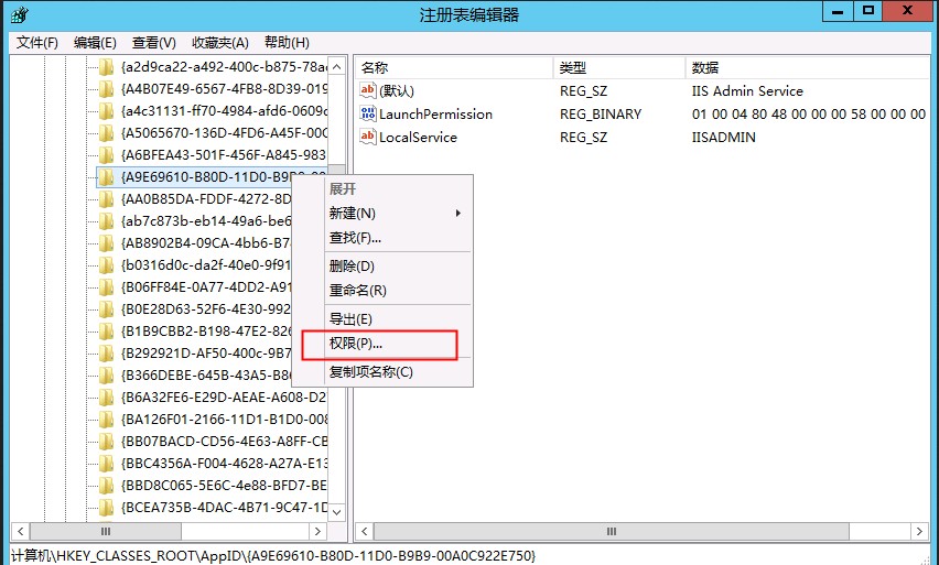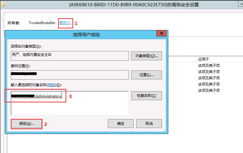 阿里云无法更改IIS Admin Service 属性 问题描述: 在需要配置IIS Admin Service 属性时,发现图标/属性为灰色,无法更改的问题是由于权限问题导致的。 问题解决: 用户需要在Windows Server 2008 R2 上修改 “IIS Admin Service” ,用户还需要授予本地管理员组有注册表权限,步骤如下所示: 1. 首先在组件管理器中查到IIS的appid,如下图所示: 2. 然后使用regedit, 找到 HKEY_CLASSES_ROOT\AppID\{刚查到的ID},如下图所示: 3. 然后右键点击{刚查到的ID},选权限,如下图所示: 4. 在权限设置窗口中点高级, 选择所有者标签, 选中administrators为所有者,如下图所示: 5. 授予administrators组有读/写等所有权, 注意:用户一定不要修改TrustedInstaller的权限 6. 然后重新执行组件管理器,就可以修改权限了。 如果问题还未能解决,请联系售后技术支持。