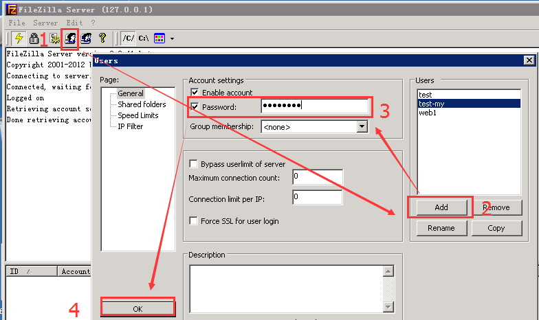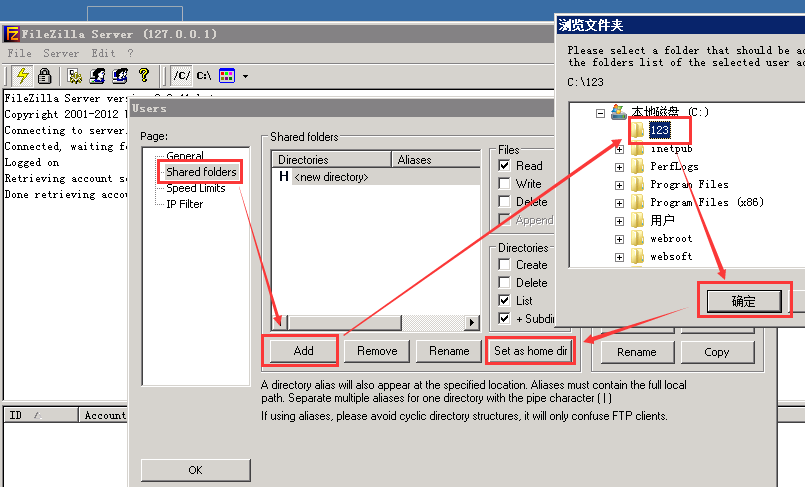 如何使用FileZilla进行FTP站点配置 用户可参考以下步骤,使用FileZilla配置FTP站点: 1、首先需要打开Filezilla Server服务端: 点击【Edit】->【Users】,或者点击如下图标新增用户都可以。 2、在添加FTP帐号后,设置该FTP帐号对应的文件目录。如下图所示: 3、完成上述设置后,本地客户端就可以进行FTP连接。如下图所示: 上一条: 如何解决服务器被肉鸡 下一条: 如何使用Windows系统云服务器