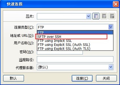 Linux 没有安装vsftpd临时要上传下载文件,就可用sftp功能。通常只要开了ssh登录功能,sftp功能就可使用。 支持sftp功能的软件很多,比如flashfxp xftp等。 本文主要介绍flashfxp这个大家熟知的工具。 打开flashfxp 如图所示: 点击红色图标新建连接,出现下图(注意连接类型) 点击“连接类型”,选择第二个“ sftp over ssh”如下图 然后输入你的服务器ip、 帐号、密码、端口(默认是 22) 不用改,若你服务器上ssh 端口修改过这个地方需要改成你自己设置的ssh端口。 填写完成后点击连接,若你没有输入错误的话,就出现下图 点击“接受并保持”即出现下图 这样就连接成功了。 接下去的操作和ftp操作都是一样的,注意不要随便删除文件,若重要系统文件被删除,系统也许会出现各种异常,甚至崩溃!