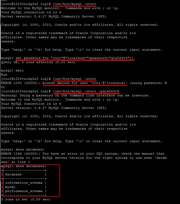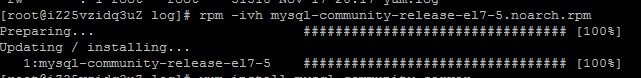 需到官网下载mysql-sever文件 # wget http://dev.mysql.com/get/mysql-community-release-el7-5.noarch.rpm 看到下载成功 然后执行 # rpm -ivh mysql-community-release-el7-5.noarch.rpm 输出内容如下就表示成功 再执行 # yum install mysql-community-server -y 显示Complete! 证明成功 成功安装后 # service mysqld status看下是stop状态,执行service mysqld start启动下 初次安装mysql是root账户是没有密码的 设置密码的方法 # /usr/bin/mysql -uroot mysql> set password for ‘root’@‘localhost’ = password('你需要设置的密码'); 如下设置密码为q1w2e3r4 成功后,再次登录需输入密码才能登录