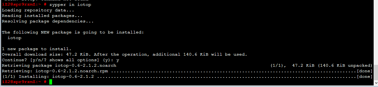 为了提升用户在云服务器上的软件安装效率,减少下载和安装软件的成本,操作系统为SUSE10的用户可通过YaST快速安装软件。 安装步骤如下所示: 1. 列出软件源 登录操作系统为Linux的云服务器后,默认已获取root权限: 在root权限下,通过命令 service-list 或 sl 列出软件源,示例如下: zypper sl 2. 添加软件源 增加源的方法执行链接中的脚本就行了,点这里 3. 搜索软件包 通过命令search或se搜索软件包,示例如下: zypper se iotop 结果如下所示: 4. 安装软件包 根据搜索到的软件包的名字(Name)安装软件。 如果要安装多个软件,中间用空格隔开。 请注意:安装软件时,若需依赖包,会自动下载安装,用户无需自己安装依赖包。 通过命令install或in安装nginx软件包,示例如下所示: zypper in iotop 结果如下所示: 安装完成就可以正常使用。 直接输入iotop