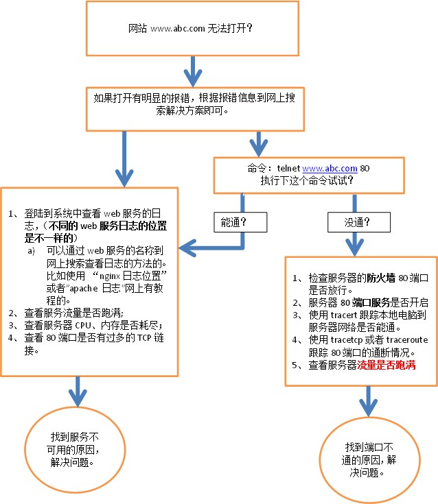 网站无法访问处理流程建议如下图所示,这里我们以www.abc.com为例,实际排查时,将域名修改为真实域名或IP就可以了。