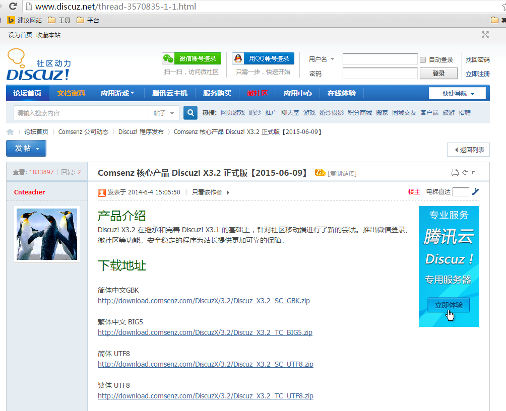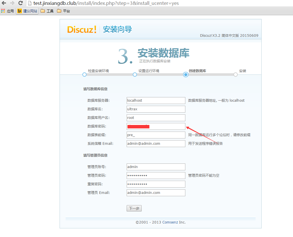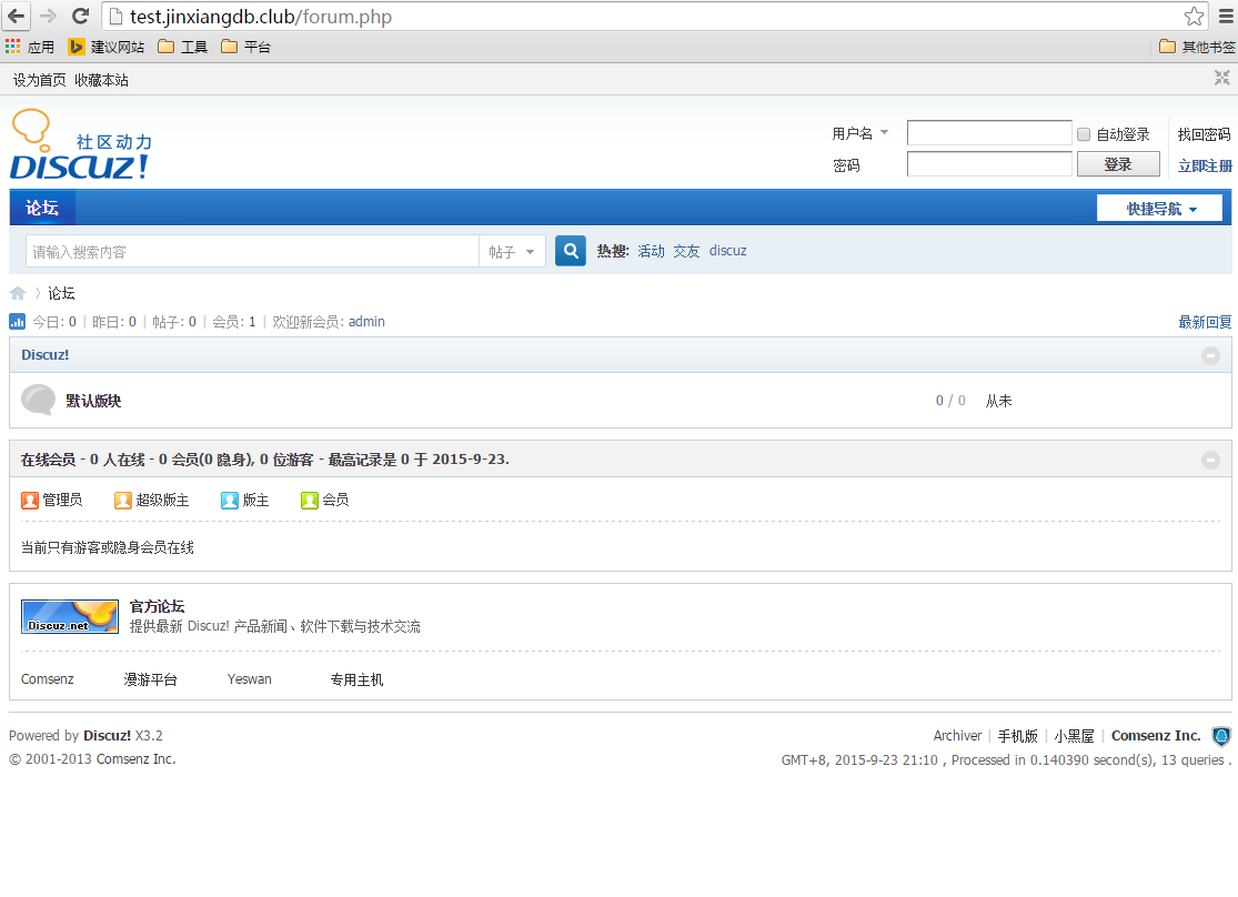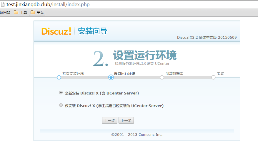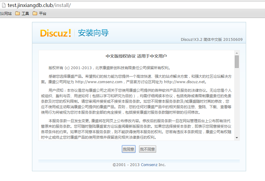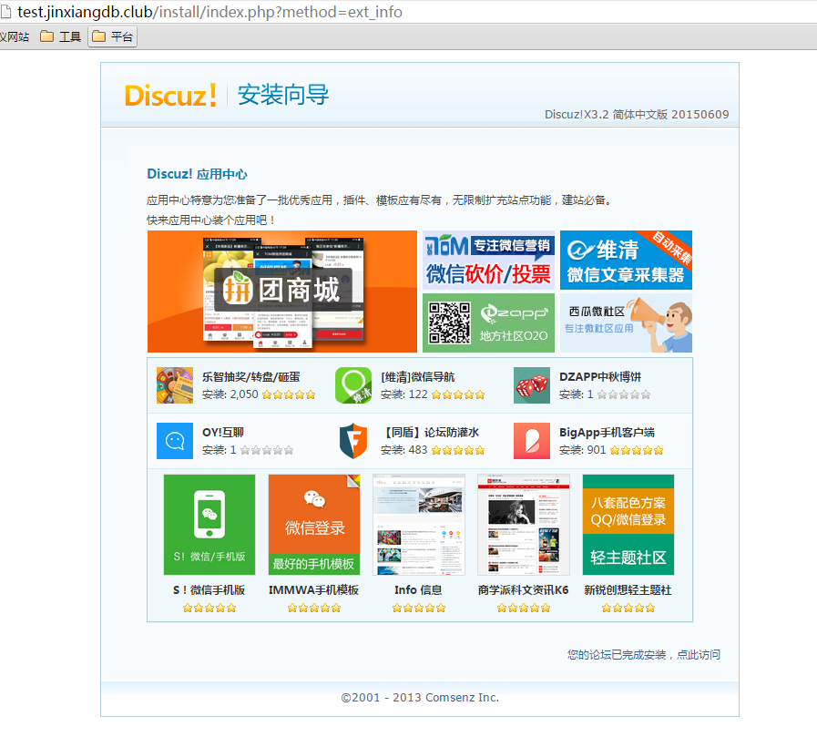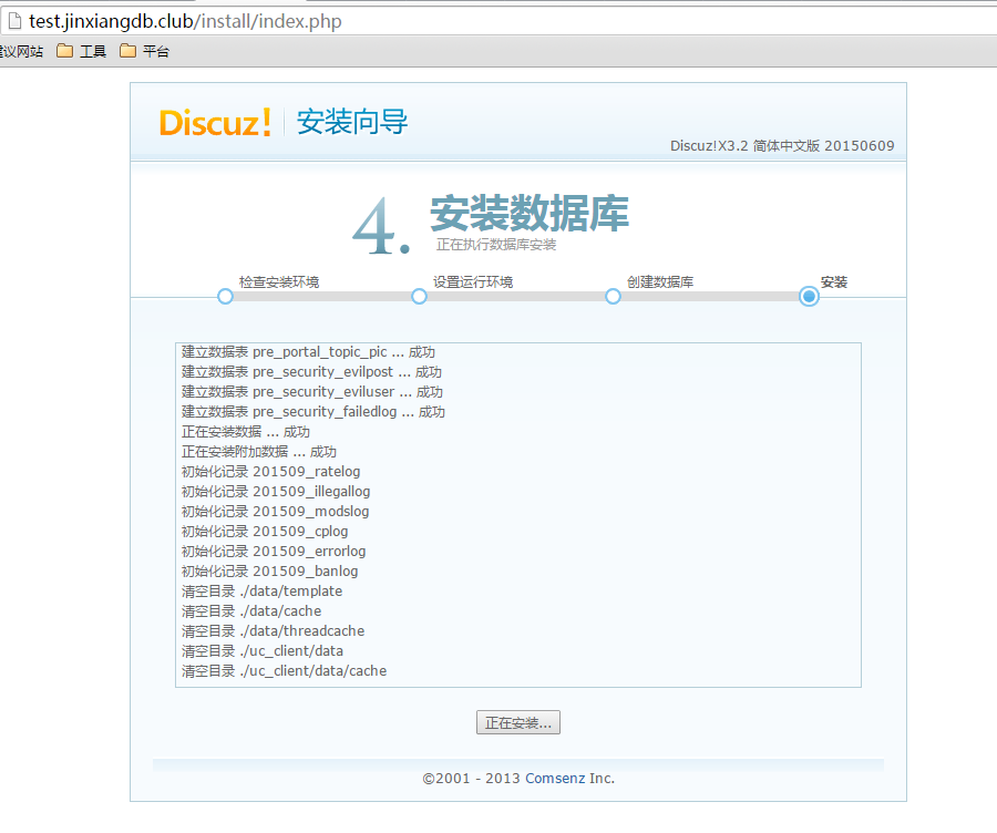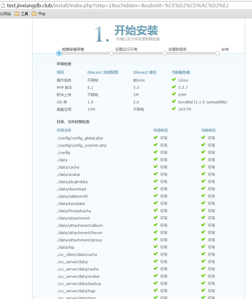 首先访问:http://www.discuz.net/forum.php地址下载最新的Discuz! 程序。 服务器使用wget http://download.comsenz.com/DiscuzX/3.2/Discuz_X3.2_SC_GBK.zip 直接下载 unzip Discuz_X3.2_SC_GBK.zip 命令解压文件 将安装文件移动到已经配置好的站点跟目录下,修改站点文件目录权限,访问安装测试。 检查页面通过 设置运行环境 配置数据库连接信息,主要注意数据库地址,还有用户名、密码输入正确 安装过程 安装完成 使用域名访问测试