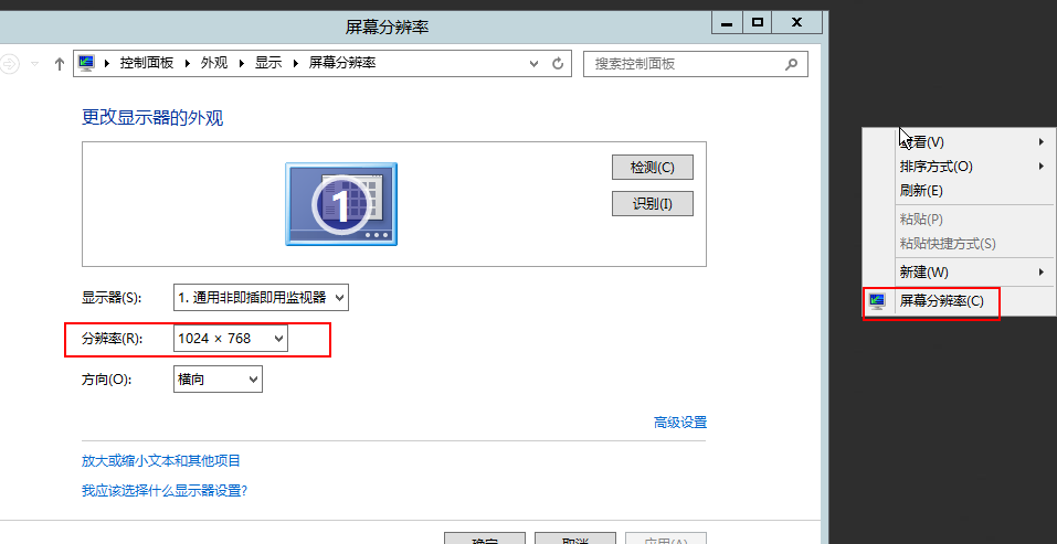 Windows 2008及以上版本的系统是在桌面右键选择屏幕分辨率,然后直接调整。如下图所示: