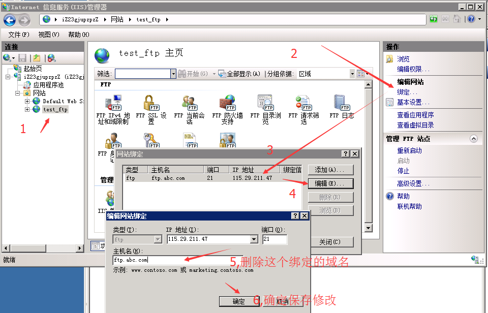 ECS Windows服务器IIS FTP登陆提示530 valid hostname is expected如何解决 问题描述: IIS 7.5下的配置的FTP如果绑定了域名,通过IP等方式连接FTP时如果出现“530 valid hostname is expected”或者“503 Login with USER first”报错 解决方法: 1.将域名绑定删除,然后直接通过用户名登录,参考下图修改即可。 2.若是FTP绑定的域名是ftp.abc.com,用户名为user则登录时需要用ftp.abc.com|user。注意中间用"|"分隔。 如问题还未解决,请联系售后技术支持。