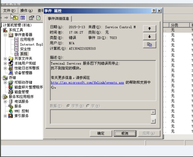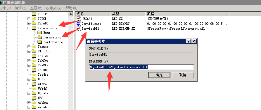 如何解决Windows系统ECS服务器无法开启Terminal Services Windows系统ECS服务器Terminal Services服务异常停止,造成系统无法远程的排查思路如下所示,用户首先通过管理终端登陆服务器,再通过事件查看器检查是否有如下报错日志,如下图所示: 出现这类情况可通过如下方法进行解决: 1. 首先点击【开始】->【运行】->输入【regedit】回车,打开注册表,如下图所示: 2. 然后找到HKEY_LOCAL_MACHINE\SYSTEM\CurrentControlSet\Services\TermService\Parameters,将ServiceDll数据改为C:\WINDOWS\System32\termsrv.dll 。如下图所示: 重启服务器后测试远程是否恢复即可。 如问题还未解决,请联系售后技术支持。