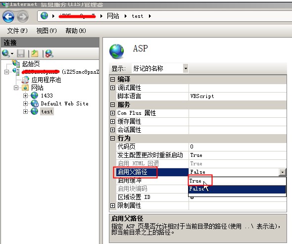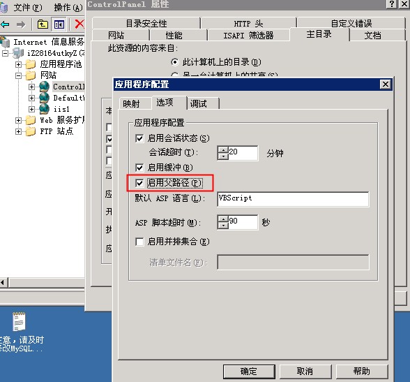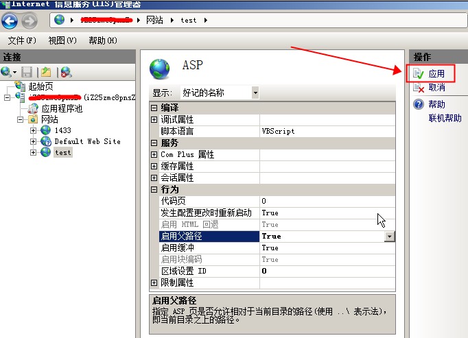 如何解决Windows系统IIS环境ASP程序访问提示"Active Server Pages错误 'ASP 0131'"不允许的父路径 问题描述: Windows系统通过IIS6配置的站点,asp程序访问时提示"Active Server Pages错误 'ASP 0131'",不允许的父路径,如下图所示: 问题原因: 代码中使用了../这样的相对路径,需要IIS开启父路径功能支持. 解决办法: win2008下设置如图: 点击具体的网站-->双击"ASP";如图所示: "启用父路径"---选择为true;如图所示: 点击--"应用"即可,如图所示: win2003系统: 右击该网站→属性→主目录→配置,如图所示: 选项→勾选“启用父路径”,确定即可,如图所示: 如问题还未解决,请联系售后技术支持。