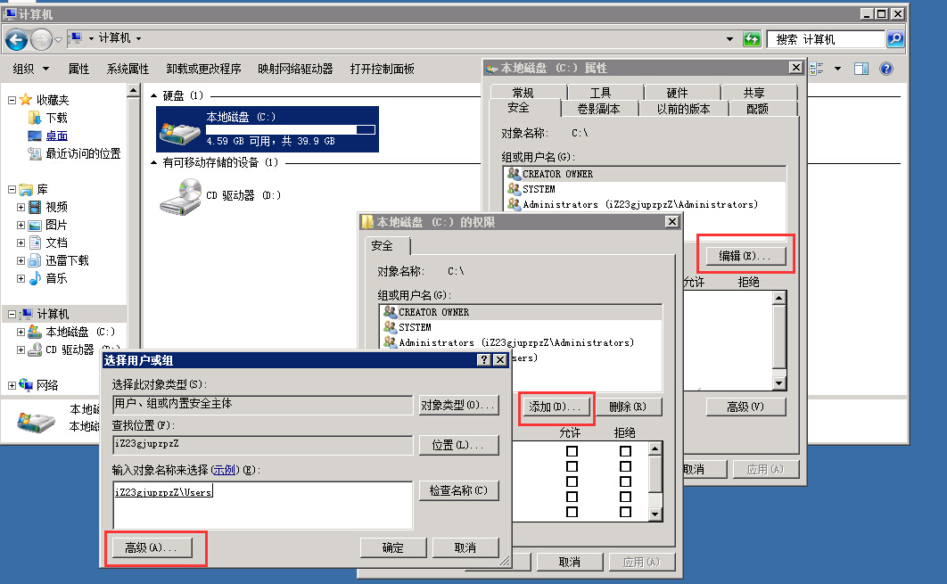 如何解决ECS Windows 2008系统无法安装补丁更新,报8000FFFF错误 出于安全的考虑,ECS Windows 2008系统取消了C盘根目录的Users权限,如果系统更新时候报8000FFFF错误那么很有可能是由于Users权限问题所导致的。 当出现这类报错时,只需远程连接服务器,然后打开【计算机】--右键打开C盘【属性】--【安全】--【编辑】--【添加】--【高级】,然后添加C盘根目录的Users读取和运行权限就可以顺利安装补丁了。 建议:基于安全的考虑,在补丁更新后取消该权限即可。 如问题还未解决,请联系售后技术支持。