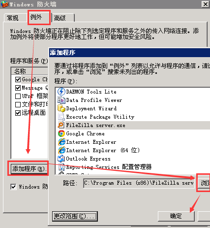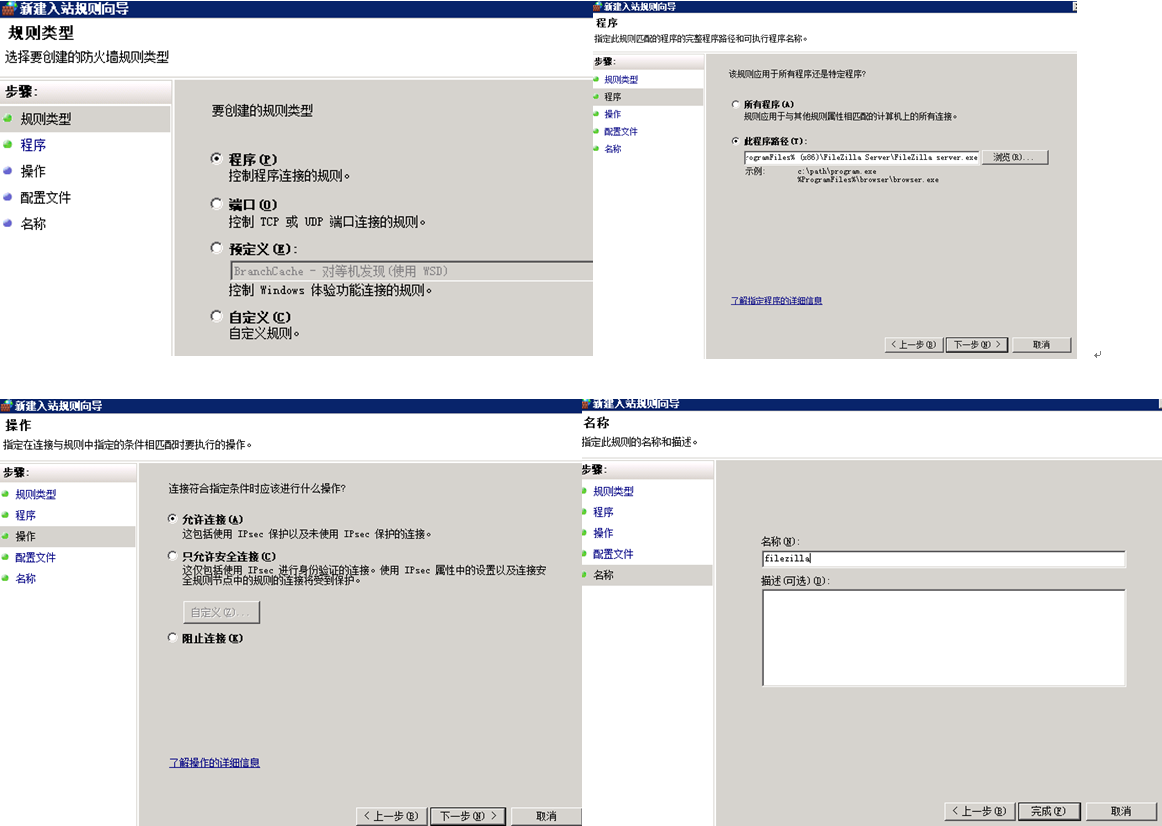 如何解决外部用户无法访问ECS Windows中的FileZilla Server 当用户遇到该问题,可通过在Windows系统中添加FileZilla进程到防火墙入站规则来解决问题。 Windows 2008具体步骤: 依次点击:【开始】->【管理工具】->【高级防火墙】->【入站规则】->【新建规则】->【程序】->【下一步】->【此程序路径】->选择FileZilla安装路径下的【FileZilla server.exe】->【下一步】->【允许连接】->自己定义该规则名称->点击【完成】,具体如下图: Windows 2003具体步骤: 依次点击:【开始】->【控制面板】->【Windows防火墙】->【例外】->【添加程序】->【浏览】->选择FileZilla安装路径下的【FileZilla server.exe】->【确定】,具体如下图: 如问题还未解决,请联系售后技术支持。