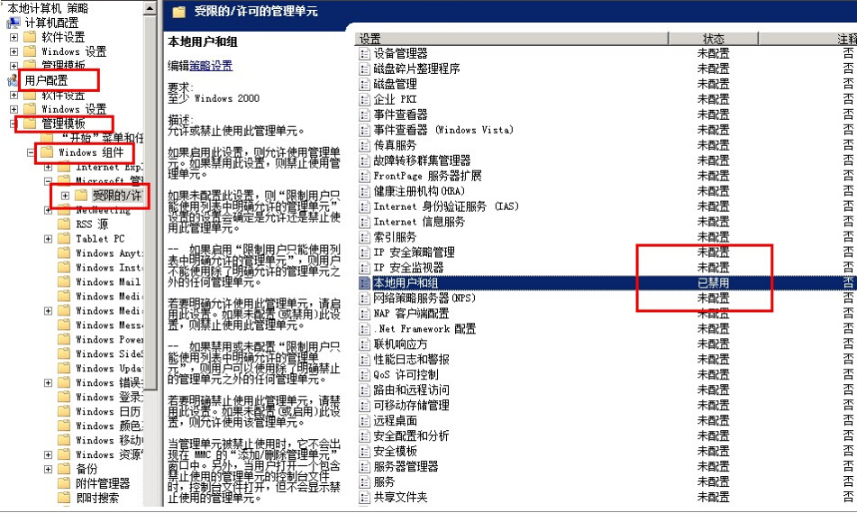 如何解决ECS Windows系统本地用户和组不显示 用户有时会遇到服务器管理器的配置中没有本地用户和组的情况,查看服务器管理器中的状态如下图所示: 服务器默认对此没有设置,一般是由于修改了组策略中的设置所导致的,用户可以检查【开始】->【运行】->输入:gpedit.msc,然后选择【用户配置】->【管理模板】->【Windows组件】->【Microsoft 管理控制台】->【受限的/许可的管理单元】->【本地用户和组】选【未配置】,设置后恢复即可。如下图所示: 如问题还未解决,请联系售后技术支持。