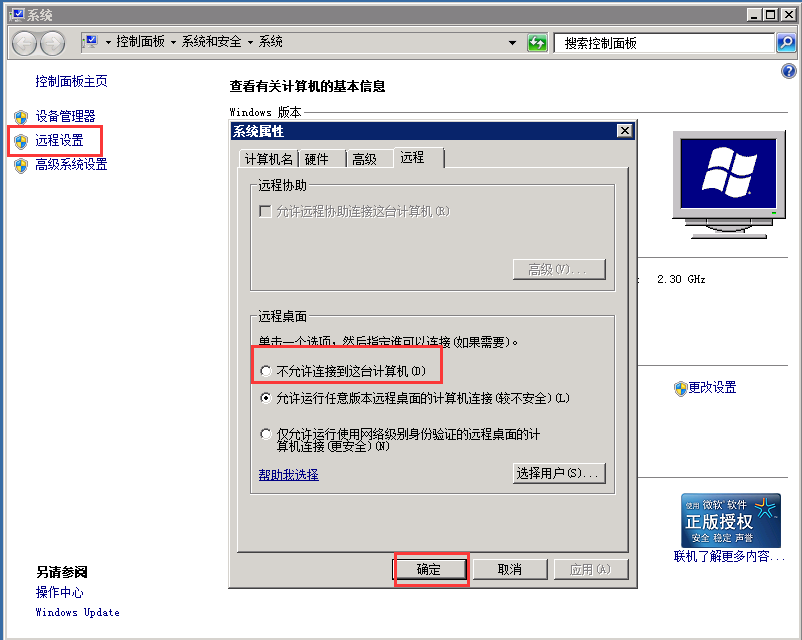 ECS Windows系统临时关闭远程桌面的方法 操作需求:临时关闭Windows服务器的远程桌面服务,需要的时候再开启。 操作方法:Windows 2003/2008/2012的方法不尽相同,以下一一列举。 Windows 2012系统: 登录服务器后打开“文件夹”,然后右键点击“这台电脑”——选择“属性”,如下图: 在打开的页面中选择“远程设置”,然后勾选为“不允许连接到此计算机”,确定即可,如下图: 需要远程桌面登录时,可以通过ECS管理控制台的“更多操作”里的“连接管理终端”连接服务器,然后将远程桌面的选项恢复为允许即可。“连接管理终端”使用方面的帮助,可以参考:【点此查看】 Windows 2008系统: 登录服务器后点击“开始”,右键点击“计算机”——选择“属性”,如下图: 在打开的页面中,选择“远程设置”,然后勾选为“不允许连接到这台计算机”,确定即可,如下图: Windows 2003系统: 登录服务器后点击“开始”,右键点击“我的电脑”——选择“属性”,如下图: 在打开的页面中选择”远程“选项卡,然后取消掉”启用这台计算机上的远程桌面“的勾选,确定即可,如下图: 如问题还未解决,请联系售后技术支持。