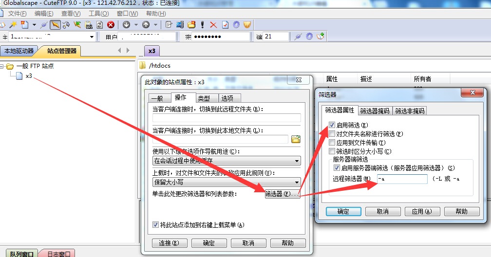 Linux服务器以"."开头的文件是隐藏文件,常见的ftp客户端默认是不显示隐藏文件的,需手工设置显示隐藏文件。以下以常用的Filezila和Cuteftp的设置方法为例,其它ftp客户端可参考客户端软件官方文档。 Filezila设置显示隐藏文件方法 1、打开FileZilla,点击最上面工具栏的【服务器(S)】→勾选【强制显示隐藏文件(H)】→【确定】。 2、断开并重新连接即可。 如下图所示: Cuteftp设置显示隐藏文件方法 1、选择界面上的 [站点管理器] 标签 2、选择想要看到隐藏文件的远程服务器站点(单击它(就是按下鼠标左键, 再松开)) 3、在菜单中选择 [文件] > [属性] 或按键盘上的 Alt + Enter 再或者右键单击它,选择 [属性] 4、选择 [操作] 标签 5、选择最下面的 [筛选器] 6、选中 [启用过滤(E)] 和 [启用服务器端筛选(服务器应用筛选器)(S)] 7、在 [远程筛选器(M)] 右侧的输入框中输入: -a 8、单击 [确定],断开并重新连接ftp即可。 如下图所示:
