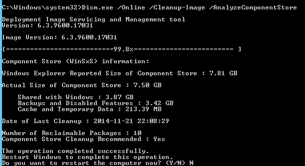 阿里云ECS Windows 2012 winsxs目录清理问题 问题描述: Windows 2012 WincSXS 占用的空间比较大,需要清理 WinSXS 包含所有版本的service pack 和 hotfix, 方便安装历史查询以及后续的升级/卸载。 时间久了就会造成WinSXS 空间比较大。 问题排查与解决方案: 1. 由于hard Link 的存在,explore 看到的文件大小不一定是准确的,用户使用下面的命令查看实际的使用大小,如下图所示: 如果显示component store cleanup recommended 显示为yes, 建议执行下面的步骤cleanup shared with windows 是安全文件。 Backups and disbled features 和 cache and temporary data 是可以清理的。 2. Cleanup 命令为: Dism.exe /online /Cleanup-Image /StartComponentCleanup 注意: 用户可以考虑加参数/SPSuperseded 或/ResetBase 如果加/SPSuperseded, 那么已经安装service pack 就不能再卸载了, 如果加/ResetBase, 那么已经安装的service pack 和 hotfix 都不能卸载了。 其他建议 1. 用户也可以使用cleanmgr.exe进行清理 (此方法默认只适用win 7, 其他版本需要安装desktop experience ). 参考【点此查看】 2. Windows 2012 r2 可以通过powershell 删除不需要的role/features. 但是后续恢复已经删除的role/features 会比较麻烦。 详细请参考【点此查看】 3. Dism 使用参考: 【点此查看】 【点此查看】 如果问题还未能解决,您可以到阿里云社区进行免费咨询,或联系云市场商家寻求帮助。
