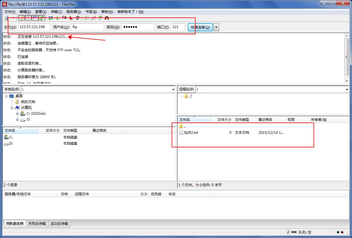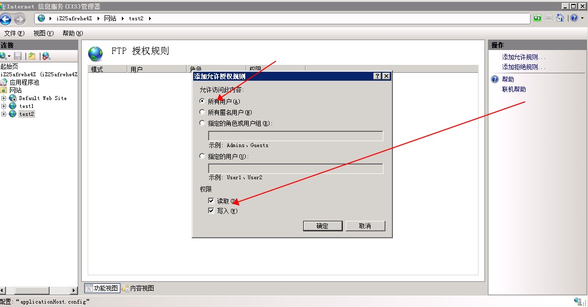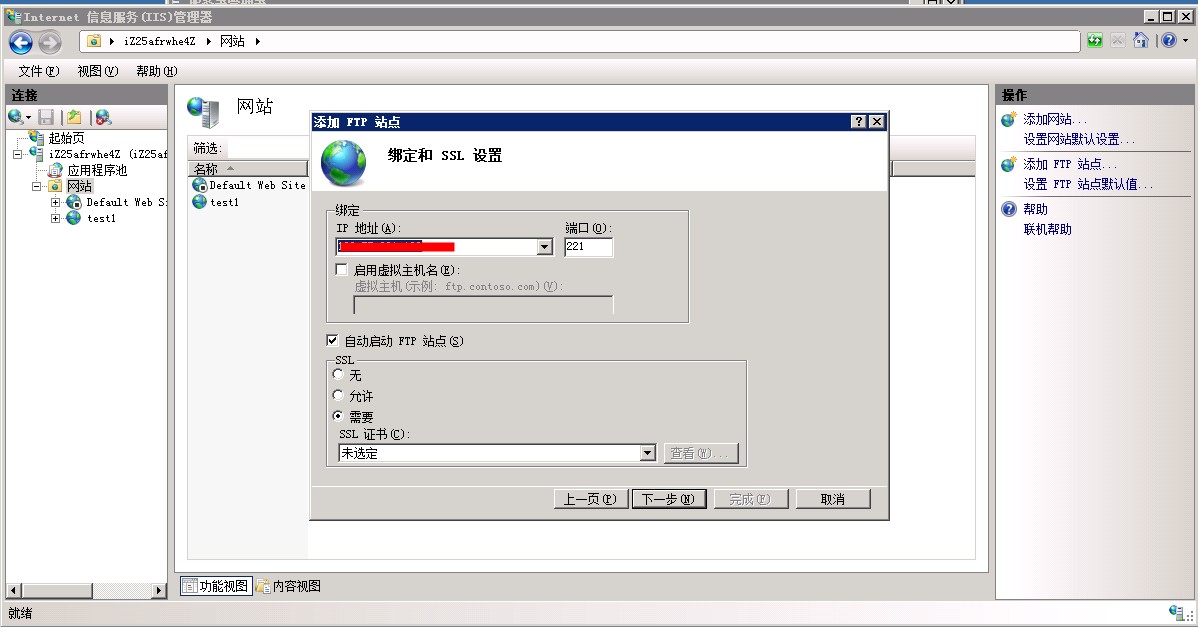 ECS Windows云服务器如何ftp创建多个站点 ftp想要搭建多个站点可以通过不同的端口号进行实现,FTP数据端口为20,标准命令端口号为21。 第一个ftp站点默认的21端口就可以了。 1.首先进行添加第一个ftp站点,选择本机外网ip,端口默认为21,如下图所示: 2. 然后选择创建第二个ftp站点,并且指认端口22.如下图所示: 3. 然后对ftp进行添加权限,可以指认所有人访问,也可以进行指定相应的用户。如下图所示; 4. 然后使用相同的账户不同的端口进行测试。如下图所示: 如果问题还未能解决,您可以到阿里云社区进行免费咨询,或联系云市场商家寻求帮助。