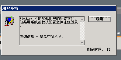 如何解决ECS Windows 2003登录提示磁盘空间不足 问题描述: 远程登录Windows 2003 的时候报错。“远程链接服务器,显示无法加载本地文件,提示磁盘空间不足,无法调整数据文件。如下图所示: 调试步骤如下所示: 1. 用户首先在登录的时候,系统需要在c:\users 下面创建profile,当磁盘空间不足时就会创建失败, 2. 然后经过检查发现没有可用磁盘空间, 打开explore, 右键点击c:\, 显示可用空间为0, 3. 然后查看哪些文件占用空间大(使用treesizefree 工具可以查看), 找到此文件,查看文件是否有用,如果没有用,清理掉即可, treesizefree 使用样例如下所示: 解决方案: 做镜像备份,磁盘清理即可。 如果问题还未能解决,您可以到阿里云社区进行免费咨询,或联系云市场商家寻求帮助。
