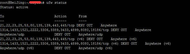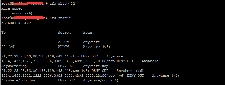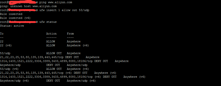 Ubuntu系统ECS使用“如何通过防火墙策略限制对外扫描行为”中的脚本进行安全防护后出现系统无法远程或者数据库不能连接的现象,是因为脚本限制对外的数据包请求导致的,按照下列操作根据自己实际使用的端口情况进行修复就可以了: 1. 先看下现在的规则,没有允许入方向的22端口。 2. 加一下入方向的ssh,加完之后测试可连接(3306等也是这样) 执行命令:ufw allow 22 3. ping 域名提示 “unkonwn host”,需添加域名解析的规则。 执行命令:ufw insert 1 allow out 53/udp(为什么与上面的添加规则不一样,首先out链已有规则了,这条允许出的 规则需加在最上面,所以用insert 1 意思是加在第一条前面,后面的意思就是允许53端口出方向的udp协议)。