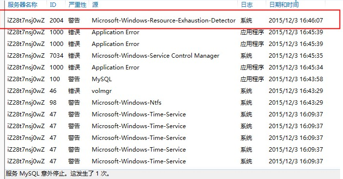 如何排查ECS Windows服务器MySQL无法启动 问题描述: Windows主机,部署MySQL程序后,想要重启开机无法自动启动,同版本在其他服务器运行正常。 分析解决: 排查Windows系统日志,发现有如下报警记录: Microsoft-Windows-Resource-Exhaustion-Detector 2004。如下图所示: 出现该问题一般为系统资源不足导致,检查服务器配置为1G内存,而MySQL在windows下基本运行,需要512M左右内存。 升级服务器内存为2G后,问题就可以解决了。 如问题还未解决,请联系售后技术支持。 上一条: ECS路由表错误导致无法ping通的解释
