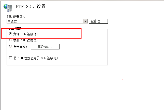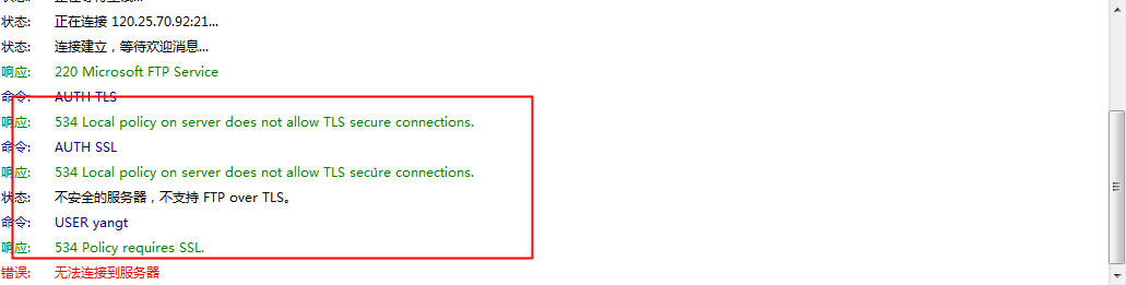 如何解决ECS Windows服务器ftp报错534 Policy requires SSL 用户使用ftp连接报错:534 Policy requires SSL。如下图所示: 用户进入Windows打开iis管理器,然后找到FTP SSL 设置。选择允许SSL连接就可以了。如下图所示: 如果问题还未能解决,您可以到阿里云社区进行免费咨询,或联系云市场商家寻求帮助。