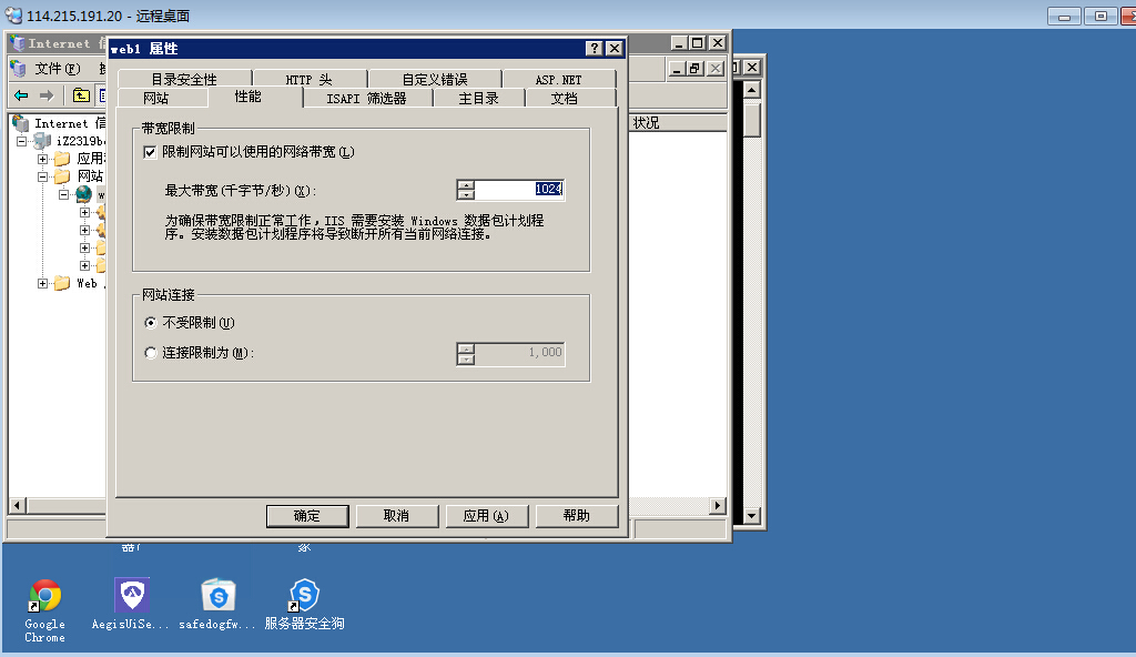 然后选择性能选项卡,勾选带宽限制,默认的1024千字节/秒即1兆带宽。如下图所示: