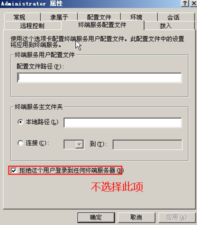如何解决Administrator被禁止登陆任何终端服务器 问题描述: 用户在使用administrator远程登陆时,出现“您已经被决绝登录到终端服务器,要解决这个问题,管理员必须在“终端服务器配置文件”设置选项卡中清除“拒绝这个用户登录到任何中断服务器”复选框。 如下图所示: 问题分析解决: 出现此提示,是由于administrator在用户属性中的终端服务器配置文件中,勾选了“禁止这个用户登录到任何终端服务器” 通过管理终端或者其它管理员用户登录服务器后,修改administrator的属性就可以了。 首先在运行中输入lusrmgr.msc 打开用户管理。找到administrator,右键单击用户--属性--终端服务器配置文件,去掉“拒绝这个用户登录到任何终端服务器”前的勾即可。 如下图所示: 如问题还未解决,请联系售后技术支持