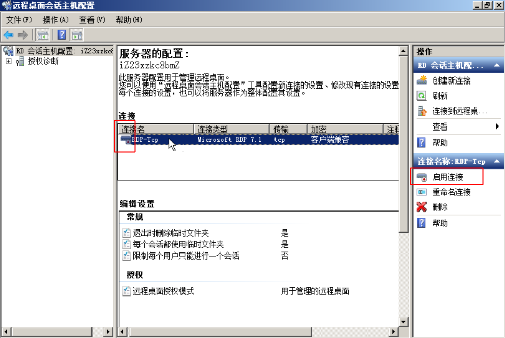 如何解决RDP连接属性配置文件被禁用导致ECS Windows无法远程 用户反馈无法通过远程桌面连接ECS Windows服务器。 首先通过【管理终端】进入服务器后, 会发现远程桌面服务运行正常,远程桌面相关组策略配置也未见异常,但是使用netstat查询发现端口未正常监听,如下图所示: 用户参阅下图,出现该问题可能是由于默认的远程桌面RDP连接属性配置文件被禁用导致的: 用户只需点击如上图所示"启用连接"按钮使相关配置文件生效,再次尝试重新远程访问服务器就可以了。 如问题还未解决,请联系售后技术支持。