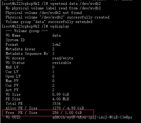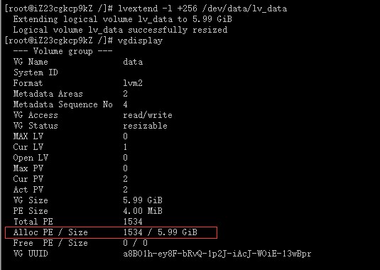 目前ECS磁盘已支持原地扩容,无需购买新磁盘来增加LVM单个分区的大小,操作方法如下所示: 1、控制台操作磁盘扩容后,可以看到磁盘已是6G(原有大小5G) 但系统内fdisk -l /dev/xvdb查看还是5G大小 2、系统中将已挂载的分区取消挂载 3、取消逻辑卷的激活状态 4、控制台操作将磁盘卸载 5、控制台重新挂载磁盘 6、fdisk -l /dev/xvdb可看到磁盘空间变大了 7、fdisk /dev/xvdb对磁盘进行分区操作,添加一个分区并保存 8、fdisk -l /dev/xvdb此时有2个分区,分别是/dev/xvdb1和/dev/xvdb2 9、将新增的分区加入到卷组中,vgdisplay可看到Free PE有多出来 10、lvextend -l +256 /dev/data/lv_data增加空间进来,vgdisplay可查看到Free PE为空了 11、resize2fs /dev/data/lv_data变更分区大小 12、挂载分区可查看到空间变大了,原有数据还在。 请注意:操作示例中data是VG名称,lv_data是逻辑卷名称,请根据实际情况填写