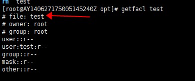 x ( execute,执行 )对应数字1:对文件而言,具有执行文件的权限;对目录了来说该用户具有进入目录的权限。 w ( write,写入 )对应数字2:对文件而言,具有新增、修改文件内容的权限;对目录来说,具有删除、移动目录内文件的权限。 r ( read,读取 )对应数字4:对文件而言,具有读取文件内容的权限;对目录来说,具有浏览目录的权限。 - :不具备任何权限。 使用命令chmod 444 test修改test文件权限,如下图所示,修改为444 查看linux下的acl权限,ACL可针对单个用户,单个文件或者目录来进行r,w,x的权限设定,特别适用于需要特殊权限的 使用情况。简单地来说,ACL就是可以设置特定用户或用户组对于一个文件/目录的操作权限。 可使用命令df查看自己的系统盘的盘符,然后通过盘符通过以下命令查看是否支持acl权限。 使用命令dumpe2fs /dev/xvda1 |grep acl查看是否支持acl权限,若不支持可使用命令mount -o remount,acl /dev/xvda1重新挂载设置。 ACL使用两个命令来对其进行控制 getfacl:查看某个文件/目录的ACL设置项目 setfacl:设置某个文件/目录的ACL设置项目 setfacl 参数 -b:删除全部的acl参数 -d:设置默认acl -k:删除默认的acl参数 -m:设置后续acl参数 -R:递归设置acl,包括子目录 -x:删除后续acl参数 使用getfacl命令查看文件的acl权限。 [root@AY140627175005145240Z opt]# getfacl test # file: test # owner: root # group: root user::r-- group::r-- other::r-- 创建个测试账号test,设置acl策略,让用户test至存在只读的权限。 切换用户test进行vim编写,发现无法编写,只存在只读权限,设置成功 并且使用命令getfacl test查看发现权限也已经修改成功,如下图所示: