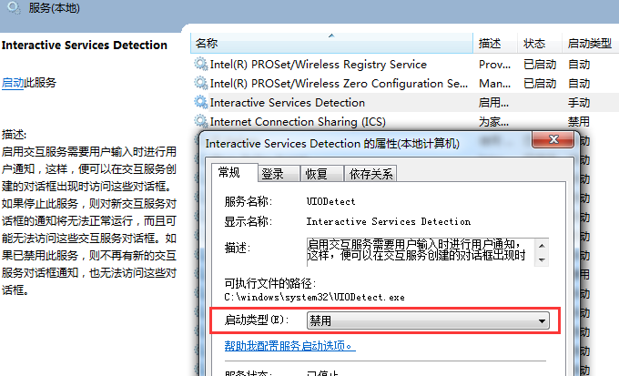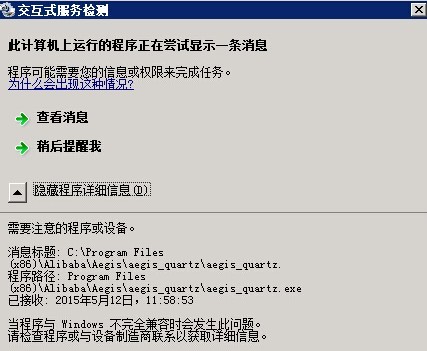 阿里云ECS Windows交互式服务检测窗口间歇出现 在对服务器进行管理维护过程中,有时会遇到每间隔几分钟会弹出“交互式服务检测”窗口的情况,如下图所示: 出现这种情况是由于用户在服务中开启Interactive Services Detection服务所引起的。启用交互服务需要用户输入时进行用户通知,这样,就可以在交互服务创建的对话框出现时访问这些对话框。如果用户停止此服务,则对新交互服务对话框的通知将无法正常运行,而且有可能无法访问这些交互服务对话框。如果已禁用此服务,那么不再有新的交互服务对话框通知,用户也无法访问这些对话框。所以如果提示的程序没有交互式需求,用户只需要关闭这个服务就可以了,也就是设置启动类型为禁用,如下图所示: 如果问题还未能解决,请联系售后技术支持。