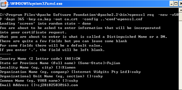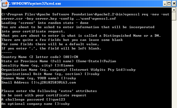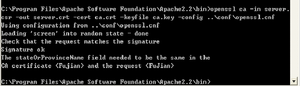 ECS Windows系统Apache配置ssl加密连接的具体方法 SSL(Secure Socket Layer): 是为Http传输提供安全的协议,通过证书认证来确保客户端和网站服务器之间的数据是安全。 一、下载并安装 支持SSL的 Apache 1.首先安装配有SSL模块的apache, 下载地址http://httpd.apache.org/download.cgi#apache23 附件提供httpd-2.2.15-win32-x86-openssl-0.9.8m-r2.msi 2.然后配置:打开Apache的配置文件conf/httpd.conf LoadModule ssl_module modules/mod_ssl.so Include conf/extra/httpd-ssl.conf 去掉两行前面的#,自定义的配置文件.conf还可以通过include包含进来。 修改httpd-ssl.conf(或者自定义的*-ssl.conf) 文件里的两个字段: SSLCertificateFile "D:/Apache2.2/conf/server.crt" SSLCertificateKeyFile "D:/Apache2.2/conf/server.key" 二、为网站服务器生成证书及私钥文件 1. 生成服务器Apache的一个RSA私钥 openssl genrsa -out server.key 1024,如下图所示: 然后生成了一个1024字节的文件server.key,生成证书签署请求CSR 2. 生成签署申请 openssl req -new –out server.csr -key server.key -config ..confopenssl.cnf,如下图所示: 其中, Country Name:两个字母的国家代号 State or Province Name:省份名称 Locality Name:城市名称 Organization Name:公司名称 Organizational Unit Name:部门名称 Common Name:你的姓名 Email Address:地址 此时生成签署文件server.csr. 三、通过CA为网站服务器签署证书 1.Generating RSA private key for CA (1024 bit) [ca.key] 生成CA私钥 openssl genrsa -out ca.key 1024,如下图所示: 多出ca.key文件 2.Generating X.509 certificate signing request for CA [ca.csr] 利用CA的私钥产生CA的自签署证书 openssl req -new -x509 -days 365 -key ca.key -out ca.crt -config ..confopenssl.cnf,如下图所示: 3.CA为网站服务器签署证书 在bin目录下创建demoCA,里面创建以下文件,index.txt,serial:serial内容为01,其他为空,以及文件夹 newcert.再执行一遍,即可生成server.crt文件 openssl ca -in server.csr -out server.crt -cert ca.crt -keyfile ca.key -config ..confopenssl.cnf,如下图所示: 四、然后将 server.crt,server.key复制到apache的conf文件夹下,重启Apache。