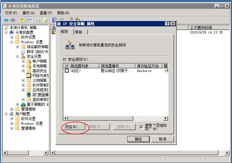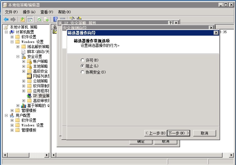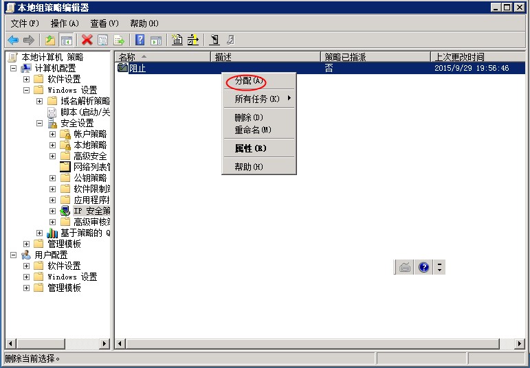 ECS Windows服务器组策略屏蔽特定ip 点击“IP安全策略,在本地机器”——>创建IP安全策略---->下一步---->名称可自定义,如输入阻止,然后点下一步,直到出现提示框,点是,一直到完成,此时就创建成功了一个名为“阻止”的策略。如下图所示: 下面选择“IP安全策略,在本地机器”——>管理IP筛选器表和筛选器操作---->点击添加---->名称添75.156.25(为了方便识别建议填写对应的IP段)---->点击添加---->下一步---->源地址填写要屏蔽的ip地址---->点击下一步---->目标地址选择我的IP地址---->下一步---->协议类型为任意---->下一步---->完成全部关闭,如下图所示: 下面开始建立的名为“阻止”的策略,点击属性---->填加---->下一步---->下一步网络类型选择所有网络连接---->下一步---->出现提示点是---->到IP筛选列表,选择我们刚才创建的名为75.156.25的选项---->下一步---->选择阻止---->下一步到完成、关闭 最后选择“阻止”这个策略,右键,分配就可以了,如下图所示: 如果问题没有解决,请联系阿里云售后技术支持