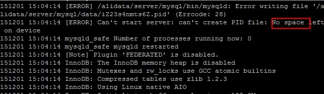 网站访问忽然报错 “Discuz! Database Error” 登录服务器检查mysql没有启动,然后启动mysql一直服务响应,查看mysql错误日志发现“Can't create PID file:No space left on device” 检查是系统盘满了而导致得 解决方案参考链接:https://help.aliyun.com/knowledge_detail/6705682.html?spm=5176.777603273.0.0.VV7hk1