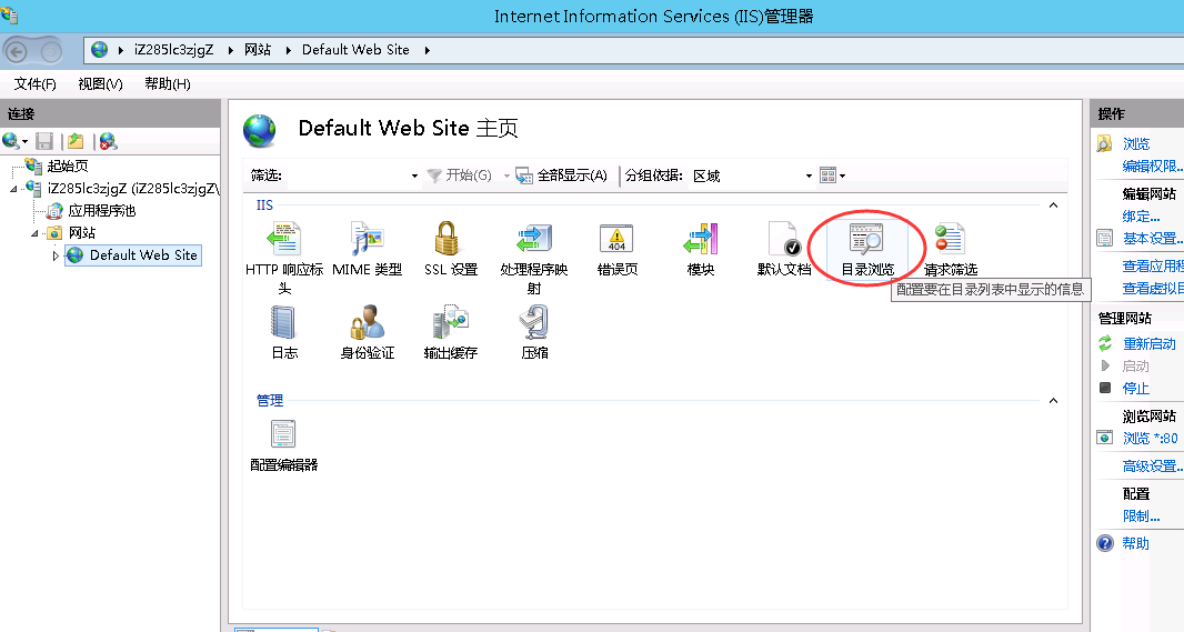 如何解决HTTP错误 403.14-Forbidden Web 服务器被配置为不列出此目录的内容 报错信息:HTTP错误 403.14-Forbidden Web 服务器被配置为不列出此目录的内容,如下图所示: 解决方法如下所示: 如果不希望启用目录浏览,请确保配置了默认文档并且该文件存在。 使用 IIS 管理器启用目录浏览。 1. 首先打开 IIS 管理器。 2. 然后在“功能”视图中,双击“目录浏览”。 3.然后 在“目录浏览”页上,在“操作”窗格中单击“启用”就可以了。 如下图所示: