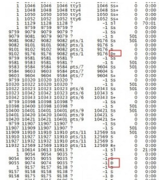 问题描述: Linux系统没有程序运行,通过top观察,发现cpu很空闲 问题解决: 通过图片看到这个Load Average 显示 8 Load 就是对计算机干活多少的度量,简单的说是进程队列的长度。Load Average 就是一段时间(1分钟、5分钟、15分钟)内平均Load 这里load一直8,那么肯定是有任务队列在排队,然后通过ps -axjf 查看任务,发现有很多个任务是D状态: D状态是指不可中断的睡眠状,此状态的进程是不能被kill掉、也无法自己退出的。只能通过恢复D状态进程所依赖的资源或重启系统。