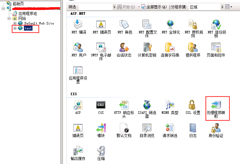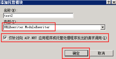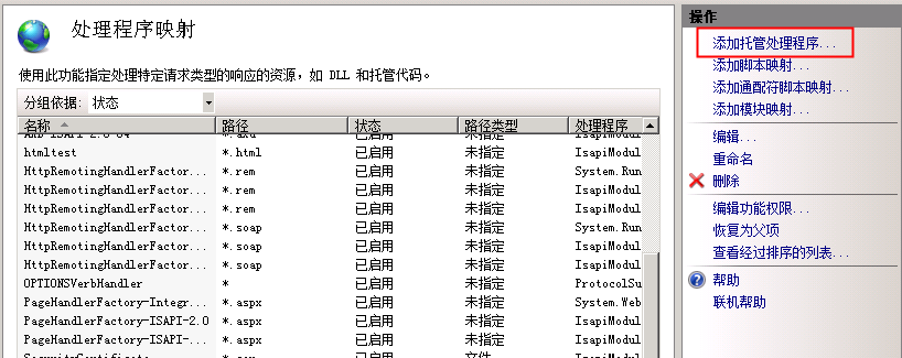 阿里云Windows2008系统服务器iis7.5伪静态脚本映射配置 首先打开iis管理器,如下图所示: 然后右键网站,选择添加网站,如下图所示: 添加网站名称,站点路径和域名,我们将站点取名为test,之后点击确定,如下图所示: 然后回到IIS主页面,在中间点击创建的站处双击选择处理程序映射这一选项,如下图所示: 在右上角操作栏目内找到“添加脚本映射”这一栏目点击,如下图所示: 请求路径设置为*.html ,可执行文件为C:\Windows\Microsoft.NET\Framework\v2.0.50727\aspnet_isapi.dll,名称可设定为htmltest,然后选择请求限制,如下图所示: 点击请求限制按钮,然后选择“谓词”这一栏目,将谓词限制为GET,HEAD,POST,DEBUG,之后点击确定,然后在是否允许中点击是,如下图所示: 在处理程序映射里面右上角找到添加通配符脚本映射选项,如下图所示: 在找到之后点击添加通配符脚本映射,路径:* ,可执行文件为C:\Windows\Microsoft.NET\Framework\v2.0.50727\aspnet_isapi.dll ,名称可定为htmltest,如下图所示: 在处理程序映射里面右上角找到添加托管处理程序映射选项,如下图所示: 请求路径:*.html ,可执行文件:System.Web.UI.PageHandlerFactory ,名称可以设置为Html-Integrate,点击确定,如下图所示: 回到IIS主页面,在中间点击创建的站处双击选择模块,如下图所示: 在右上角操作里选择添加托管模块,名称填写为test2,类型改为 URLRewriter.ModuleRewriter,勾选下面仅针对向ASP.NET,点击确定,如下图所示: 最后返回IIS主页面,将站点test应用程序池更改为经典模式,如下图所示: 至此iis7.5伪静态脚本映射配置就已经完成了。