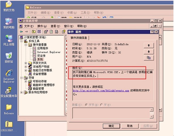 如何解决缺少.net2.0和vc9导致无法安装某些软件 问题现象:用户无法安装公司软件。 分析过程及解决方案: 工程师在测试机上安装.net 2.0 后运行客户提供的软件,安装失败后,查询系统日志信息,发现如下图错误记录如下图所示: 由此可以得出还缺少VC,下载VC9:http://www.microsoft.com/zh-cn/download/confirmation.aspx?id=29安装后再安装该软件就可以成功安装了。如下图所示: 如问题还未解决,请联系售后技术支持。 上一条: 阿里云Windows安装Sqlserver2005 教程 下一条: 阿里云第三方环境WDCP安装教程