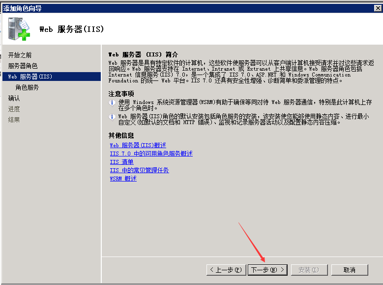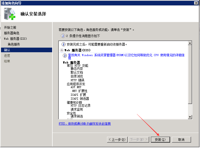 ECS Windows server 2008 安装IIS的具体方法 在Windows server 2008系统上安装IIS7 1、首先在服务器桌面右下角,打开“服务器管理”,如下图所示: 2、点击“角色”中的“添加角色”,如下图所示: 3、打开“添加角色向导”,点击“下一步”。如下图所示: 4、选择“Web服务器(IIS)”,继续“下一步”。如下图所示: 5、继续“下一步”,如下图所示: 6、这里选择需要安装的应用程序环境,一般都是ASP和.NET,选择后继续“下一步”,如下图所示: 7、然后继续“下一步”,如下图所示: 8、最后选择“安装”。如下图所示: 9、安装成功后,会显示“安装成功”,然后关闭安装界面。如下图所示: 10、在服务器的“开始” -->“管理工具”-->中打开“IIS管理器”。如下图所示: 11、在IIS管理中,可以看到IIS的默认站点,点击浏览网站,可以在浏览器中打开IIS的默认页面,IIS安装完成。如下图所示: 如问题还未解决,请联系售后技术支持