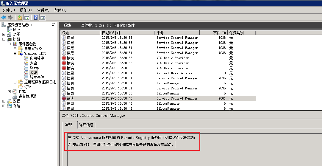 如何解决Remote Registry 服务被禁用导致ECS Windows安装DFS失败 问题描述: 用户在ECS Windows 2012系统中安装DFS组件的时候安装失败,如下图所示: 问题分析: 由于DFS组件安装配置的时候,用户需要通过Remote Registry 服务自动对系统注册表做相关设置,而ECS Windows基于安全性考虑,默认禁用了该服务。所以,该问题可能是由于Remote Registry 服务被禁用所导致的。 先在系统日志中查看到相应的错误信息,如下图所示: 解决方法: 用户可以参阅如下步骤启用Remote Registry 服务后再重试安装DFS就可以了: 1. 首先在【开始】→【运行】→【services.msc】,以打开服务管理器; 2.然后 定位到Remote Registry 服务后,双击或右击服务后,选择"属性",以打开服务属性配置对话框; 3. 将启动类型由【禁用】修改成【手动】; 4. 然后尝试重新安装DFS组件就可以了; 如问题还未解决,请联系售后技术支持。