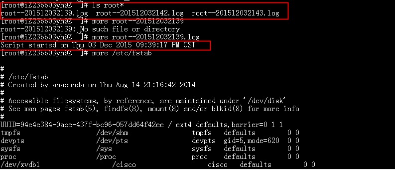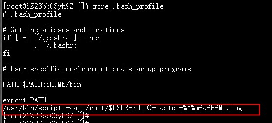 1、 Script命令可帮助管理员记录用户的操作行为,包括用户查看文件中的哪些具体内容,写入了哪些文件,写了些什么都能看到,较详细的记录了用户的操作行为。 2、Vi /root/.bash_profile 在最后一段添加/usr/bin/script -qaf /root/$USER-$UIDO-`date +%Y%m%d%H%M`.log,之后wq保存退出,如图所示: -a,该选项将会让记录附加到文件中,而不会擦除先前的记录。 -f,实时更新文件,只要用户退出后,新上的用户会自动又创建一个时间记录日志。 -q,script已静默的方式运行,用户没有感知,不然会有一行script start的提示。 3、重新登录root用户,执行more /etc/fstab文件,之后再exit退出终端,可查看到用户登录时间及使用的命令,查看的内容都会显示,如图所示: 4、同理的如有其他一般用户登录,可在/home/XXX对应的家目录中在.bash_profile中添加响应的内容,这样用户的操作记录即可看到。