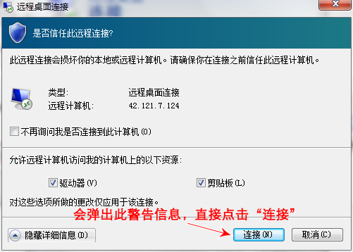 阿里云远程连接服务器For Windows 云服务器系统是windows系列的用户,可以使用自己电脑windows系统自带的“远程桌面连接”功能远程连接云服务器。国内Windows2003/2008系统自带正版激活,不收取你系统正版激活费用,同时 windows2003/2008系统默认允许最多2个session远程连接,如果用户需要更多的新增连接数,需要用户单独向微软购买远程桌面授权(RD 授权)服务,RD授权费用需要用户自理。 操作如下所示: 1、首先选择“开始菜单”-“所有程序”-“附件”->“远程桌面连接”,如下图所示: TIPS:用户也可以使用 “开始菜单”-“运行”,输入命令“mstsc”后回车,就可以启动远程桌面连接;或者使用快捷键“Win”+“R”来启动“运行”窗口,输入命令“mstsc”后回车启动远程桌面连接,如下图所示: 2、然后在计算机后面的输入框中,输入您的云服务器的外网IP地址,然后选择“连接”。如下图所示: TIPS: 1)如果需要设置保存输入的密码,点击“选项”,然后勾选“允许我保存凭据”就可以了。这样就可以复制主机的密码,不需要手动在输入。如下图所示: 输入您云服务器的用户名和密码就可以登录了,如下图所示: 2)然后远程访问windows系统主机,调整窗口大小; 在“显示”选项卡中,显示配置调整窗口大小,一般是“全屏”,如下图所示: 3)通过远程桌面共享本地电脑资源; 在“本地资源”选项卡中进行设置,一般是会勾选:1)剪贴板(从本地直接复制文字信息时用到,但不能复制文件);2)需要复制文件,需要点击“详细信息”,选择“驱动器”,勾选文件存放的盘符信息,这样就可以了。如下图所示: TIPS: 在“远程桌面连接”中,服务器身份验证可以验证您是否连接到正确的远程计算机或服务器。这个安全措施有助于防止连接到非预期的计算机或服务器,从而消除因为此错误连接导致暴露保密信息的可能性。 连接所必需的验证强度是由您的系统安全策略决定的,这个策略是由您的系统管理员设置的。如果实际的验证不符合最低的策略要求,那么会有三个可用的身份验证选项供您选择: 连接并且不向我发出警告:使用此选项,即使远程桌面连接无法验证远程计算机的身份,它仍然会连接。 向我发出警告:使用此选项,如果远程桌面连接无法验证远程计算机的身份,则会向您发出警告,以便用户选择是否继续连接。 不连接:使用此选项,如果远程桌面连接无法验证远程计算机的身份,则无法建立连接。)如下图所示: 这样在主机内就可以查看到本地电脑的盘符信息(但拷贝小文件还可以,大文件传输很慢) 注:如果要在linux 系统上远程连接windows服务器,用户可以使用Rdesktop工具。 软件【点此下载】,需在linux上编译安装。 >>windows2008 32位 64位自助激活windows正版教程(原系统激活方法) >>Windows Server 2008自动激活发布说明(自动激活版系统激活方法) >>硬盘分区和格式化for Windows 2008