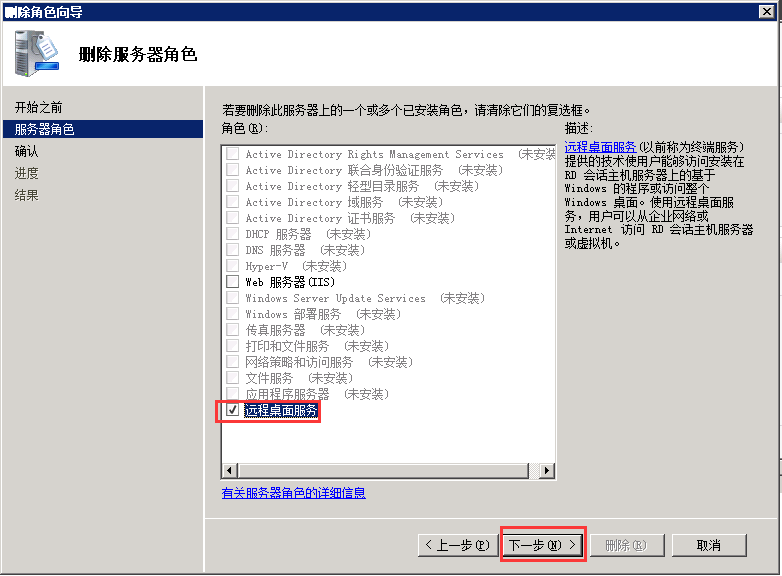 如何处理ECS Windows 2008 远程连接提示“由于没有远程桌面授权服务器可以提供许可证” 在远程桌面时出现如下图所示内容提示时: 出现此错误是由于Windows 2008 安装了【远程桌面角色】,但是此功能是120天免费的,如果超过了这个时间就要付费,会导致远程连接不上。删除【远程桌面服务】就可以恢复远程了。 通过管理终端登陆到系统中,管理终端使用方法点这里。 删除过程,用户可以参考如下操作过程: 1,首先鼠标右键点击【计算机】->【管理】,点击下【角色】,右侧点击【删除角色】。如下图所示: 2、然后点击【下一步】。如下图所示: 3.勾选下【远程桌面服务】,点击【下一步】。如下图所示: 4.然后点击【删除】。如下图所示: 5.删除完成后需要重新启动服务器,配置才可以生效,重启之后在测试远程连接就可以了。如下图所示: 如问题还未解决,请联系售后技术支持。