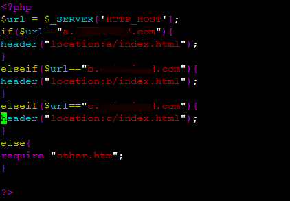 介绍多域名跳转——不同域名指向不同子目录,使用PHP程序实现的方法: 测试网站目录结构: 测试代码: 实现的效果是: 将3个域名解析到一个IP地址上,通过index.php进行判断,自动跳转到对应的子目录。 使用a.example.com访问自动跳转到a.example.com/a/index.html 使用b.example.com访问自动跳转到b.example.com/b/index.html 使用c.example.com访问自动跳转到c.example.com/c/index.html 若域名都没有匹配到,自动跳转到other.htm