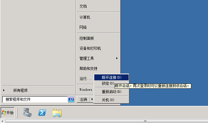 如何解决Windows 2008远程桌面时出现的界面与上次断开时不同 Windows 2008系统远程桌面连接关闭后,当再次远程连接时出现的不是自己之前的桌面。出现该问题主要是由于上次远程后未使用正确断开远程连接方式所导致的。 建议用户在每次远程登陆使用完毕后,不要直接关闭远程桌面,而是选择【开始】,然后点击【注销】右侧的黑色箭头,选择【断开连接】。这样下一次登陆时会自动登陆到上一次断开的连接。如下图所示: