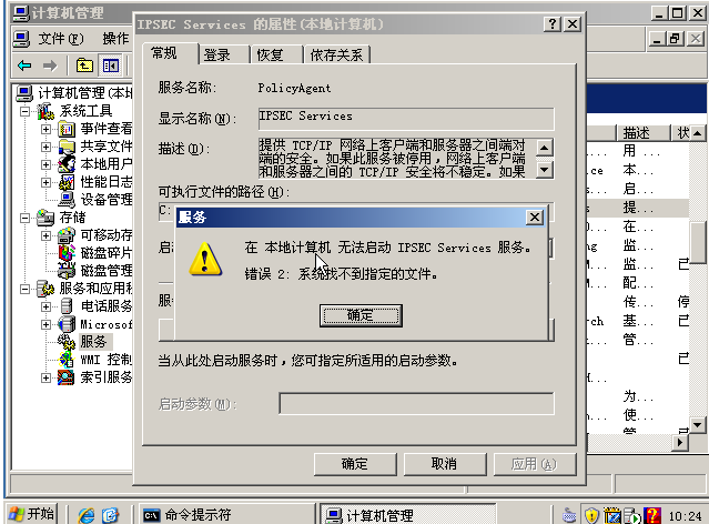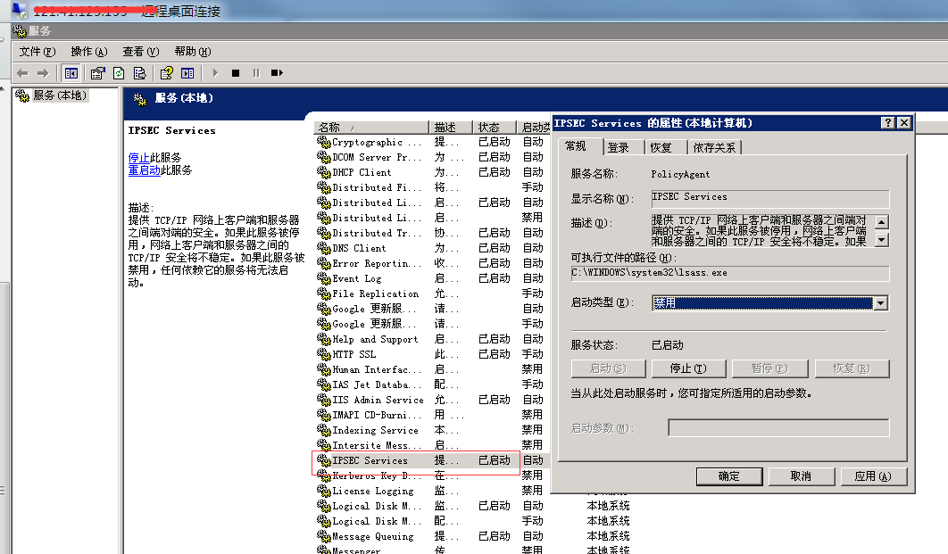 如何解决ECS Windows 2003系统IPSEC服务异常导致无法远程 在Windows 2003系统中,ECS管理控制台远程终端连接可以登录,但是无法远程连接,且无法ping通服务器IP,错误信息如下所示: 1、PING网关出现"Destination host unreachable"提示,如下图所示: 2、重启IPSEC Services服务出现如下提示,如下图所示: 解决方法如下所示: 首先点击【开始】->【运行】->输入【services.msc】回车->找到【IPSEC Services】服务->双击服务名称【启动类型选择禁用】。如下图所示: 设置完成后重启服务器再测试远程连接就可以了。 如问题还未解决,请联系售后技术支持。