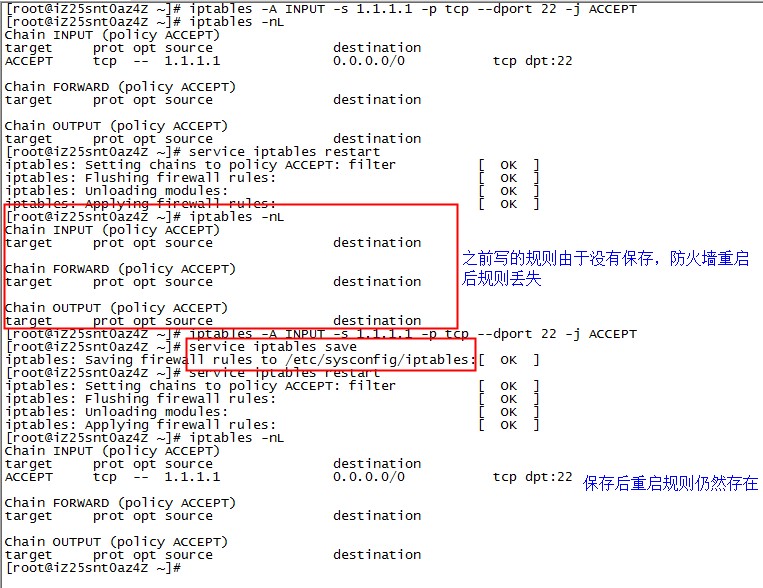 ECS Linux 防火墙每次启动从/etc/sysconfig/iptables去加载防火墙规则,因此我们每次在防火墙添加新规则时,切记要执行service iptables save,系统会把添加的规则保存到/etc/sysconfig/iptables,若没有保存,防火墙若重新启动之前写的规则就会丢失的。 如下图所示 1. 添加一条规则禁止ip1.1.1.1远程登录服务器,禁止访问服务器22端口 2. 查看防火墙规则规则存在 3. 重启防火墙 4. 再次查看防火墙规则第1步写的规则丢失了。 5. 重复步骤1添加规则 6. 保存规则 7. 重启防火墙 8. 查看规则,第5步的规则依然存在 若想把iptables规则备份一下,可执行iptables-save > /home/iptables.bak,可把iptables规则备份到home目录下的iptables.bak文件中,后续若想要恢复执行iptables-restore < /home/iptables.bak 可把/home/iptables.bak 规则导入到当前iptables里。然后执行service iptables save保存,注意一点,执行iptables-restore 会把当前iptables规则全部覆盖掉了,若是导入外部的防火墙规则文件,建议先把自己的iptables备份一份。 上一条: 如何解决ECS控制台无法连接管理终端