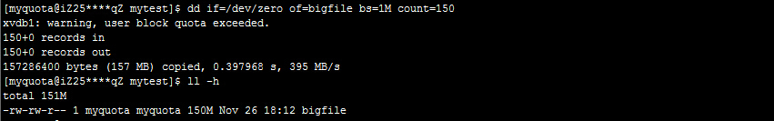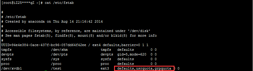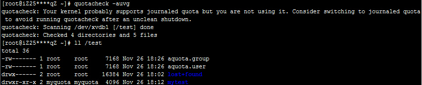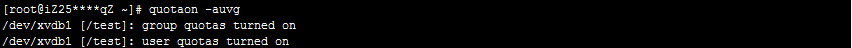 在服务器管理时,因为磁盘空间资源有限,通常需为多用户的服务器设定用户的linux磁盘配额,限制每个用户可使用的空间资源。Quota是在Linux下实现磁盘配额的工具,以下使用CentOS为例进行说明。 1、调整需进行配额管理的磁盘,在/etc/fstab中添加quota管理对应的参数 调整完成后可通过如下命令让quota生效 mount -o remount,usrquota,grpquota /对应磁盘挂载点 或也可直接重启服务器对磁盘进行重新挂载。 2、通过quotacheck扫描整个服务器系统中含有usrquota,grpquota的文件系统,扫描结束之后,会有aquota.group和aquota.user这两个文件在挂载目录下生成。 3、启动quota 请注意: 若想要关掉该服务的话可用quotaoff命令。 [root@iZ25****qZ ~]# quotaoff -u /test 4、用edquota设置用户针对特定用户(在此以myquota帐号为例)的磁盘使用限制。 edquota -u myquota 调整图中soft和hard的值,图中举例调整的是分别为软限制100M和硬限制200M。 5、测试结果如下 若该用户创建文件大小小于soft,可正常创建。 若该用户创建文件大小介于soft与hard之间,会出现警告,也可正常创建。 若该用户创建文件大小超过hard,创建失败。
