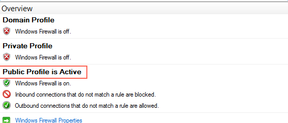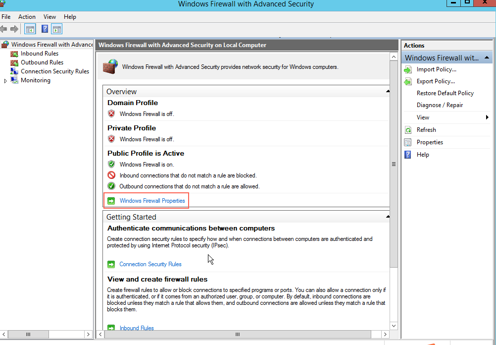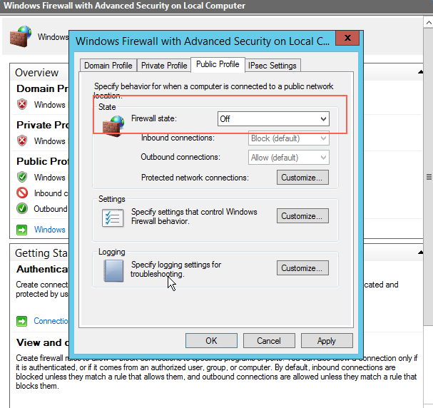 如何解决ECS Windows 2012 R2 第一次远程登录被弹出并且无法ping通以及再次远程登录 问题描述: 1. 用户选择“2012 R2 数据中心版”系统,等待系统安装。如下图所示: 2. 用户获取到公网IP之后,使用windows的”远程桌面连接“登录机器之后,第一次登陆会在页面的右侧出现如下图的蓝框: 3. 如果用户选择“No”,就会出现远程登录被弹出,并且ping不同再次尝试远程登录也无法登陆上去。如下图所示: 解决方法: 当出现上述问题时,需要自行登录控制台对防火墙设置进行更改。 1. 当用户选择“No”时,防火墙的状态如下所示,红框里面的”Public Profile is Active“. 为了远程登录,需将这个profile的防火墙功能关闭。如下图所示: 2. 关闭方法如下所示: 用户在命令行输入"wf.msc",会调出如下页面,点击页面中红框的内容,更改防火墙状态。如下图所示: 3. 将防火墙状态改为off,用户就可以进行远程登录了。如下图所示: 如果问题还未能解决,请联系售后技术支持。